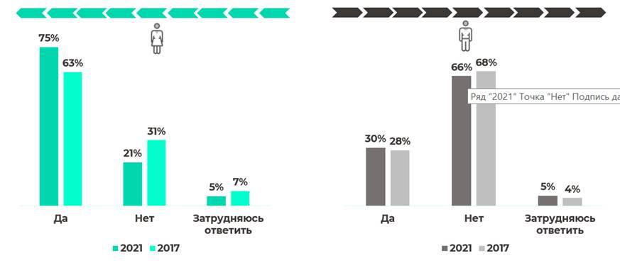 Только одна пятая (21%) женщин с таким утверждением не согласна. Мужчины думают ровно наоборот: 66% не видят никаких ограничений для женщин, и только треть (30%) согласны, что женская социальная роль накладывает ограничения на развитие карьеры.