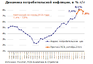 В октябре быстрый рост инфляции продолжился. Месячный прирост потребительских цен был максимальным с марта 2015 года и составил 1,1% м/м. В годовом выражении инфляция выросла до 8,1% г/г (после 7,4% г/г по итогам сентября и 6,7% г/г на конец августа). Главным драйвером инфляции остается рост цен на продукты питания, который реализуется по широкому перечню товаров. В годовом выражении продовольственная инфляция находится на максимумах с декабря 2015 года (10,9% г/г, в сентябре было 9,2% г/г).