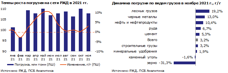 Объем погрузки на сети РЖД в ноябре 2021 года вырос на 3,2% г/г и составил 108 млн тонн, а за 11 мес. 2021 года – на 3,1% г/г. Увеличение погрузки происходило по всем видам грузов, за исключением зерна и каменного угля.
