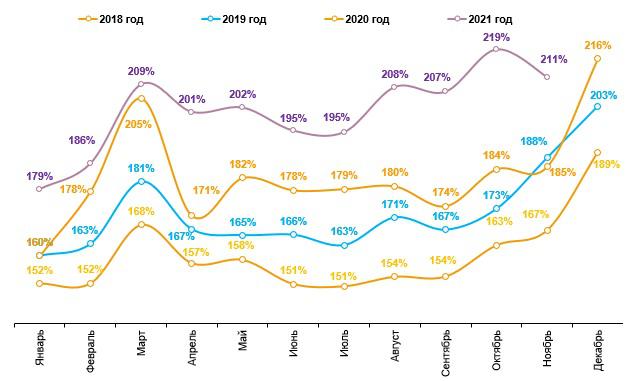 Согласно данным исследовательского холдинга Ромир, в ноябре 2021 года индекс повседневных номинальных расходов россиян составил 211%, что на 26 п.п. больше, чем в ноябре 2020-го. Относительно октября 2021-го (219%), индекс сократился на 8 п.п.