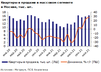 В Москве в ноябре на первичном рынке недвижимости в массовом сегменте количество лотов в продаже выросло на 28,0% г/г и составило 16,3 тыс. шт.