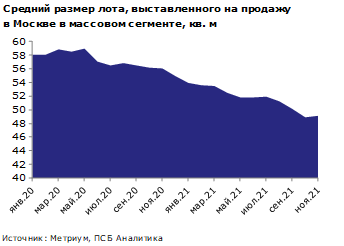 Застройщики продолжают делать акцент на компактном жилье, которое более доступно потенциальным покупателям, для поддержания продаж и цен. Средний размер лота, выставленного на продажу в массовом сегменте, в ноябре уменьшился на 12,3% г/г, до 49,2 кв. м.
