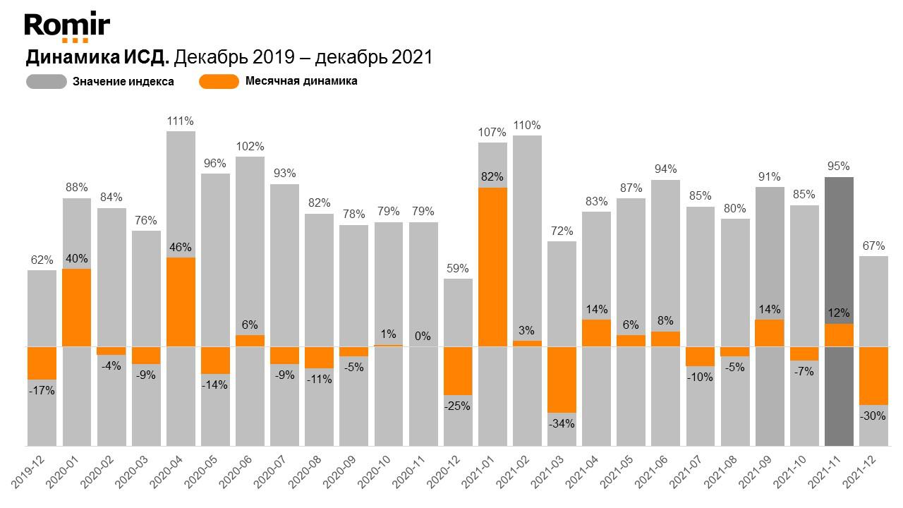 В свою очередь индекс свободных денег в декабре 2021 составил 67%, что по сравнению с предыдущим месяцем меньше на 30%. По отношению к декабрю 2020-го года (ИСД – 59%) индекс вырос на 14% (8 п.п.). Для расчета индекса за 100% принят показатель января 2019 года.