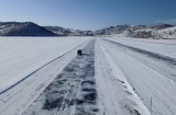 Сейчас толщина льда составляет 56 сантиметров. Уже расчищены полосы движения шириной 20 метров, между ними сделана специальная разделительная полоса шириной 50 метров. Идет разбивка дороги, установка сигнальных вешек.