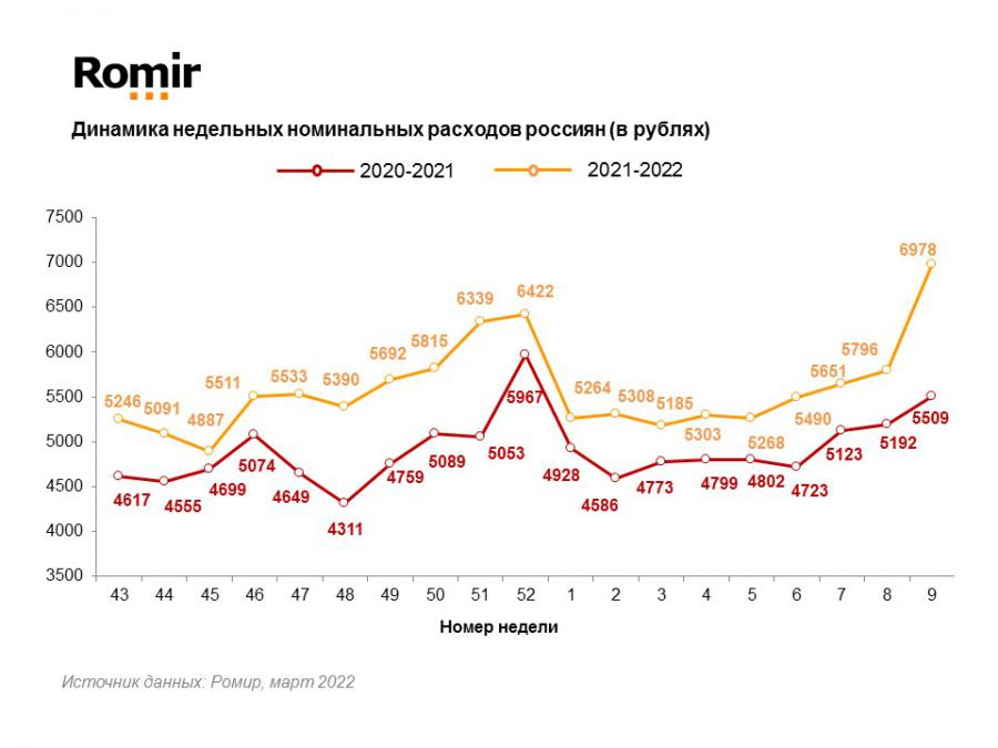 В период с 28 февраля по 6 марта он составил 6 978 рублей, что на 20,4% (1182 рубля) больше, чем на предшествующей неделе. По сравнению с аналогичным периодом 2021 года расходы увеличились на 26,7% (1469 рублей).