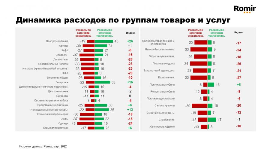 «Заявленное изменение расходов демонстрирует не только их фактический рост. В первую очередь, это индикатор того, какие товары и услуги на самом деле являются предметами первой необходимости, на которые люди готовы тратить деньги даже в условиях быстро меняющейся экономической ситуации. Также мы видим, в каких направлениях покупатели снижают свои траты, а значит, при изменении ситуации к лучшему в первую очередь вернут эти статьи расходов в свой бюджет», – отметил эксперт Ромир, руководитель исследования «М-Пульс» Илья Кацнельсон.