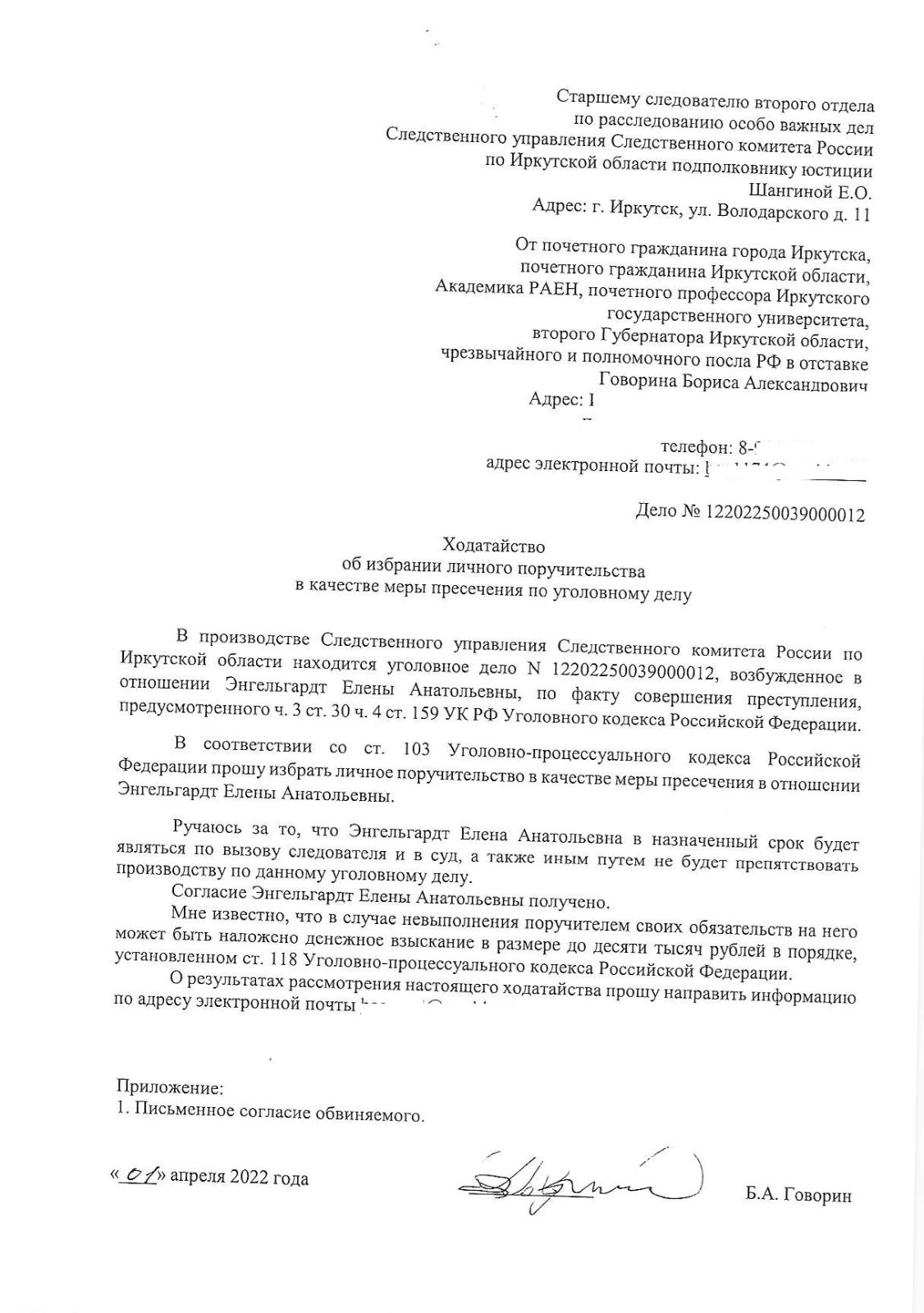С ходатайством об изменении меры пресечения в отношении директора АО Специализированный застройщик «АЗГИ» под свое личное поручительство выступил Борис Александрович Говорин, первый мэр города Иркутска, бывший Губернатор Иркутской области, почетный гражданин города Иркутска и Иркутской области. Об этом сообщается в официальном пресс-релизе компании.