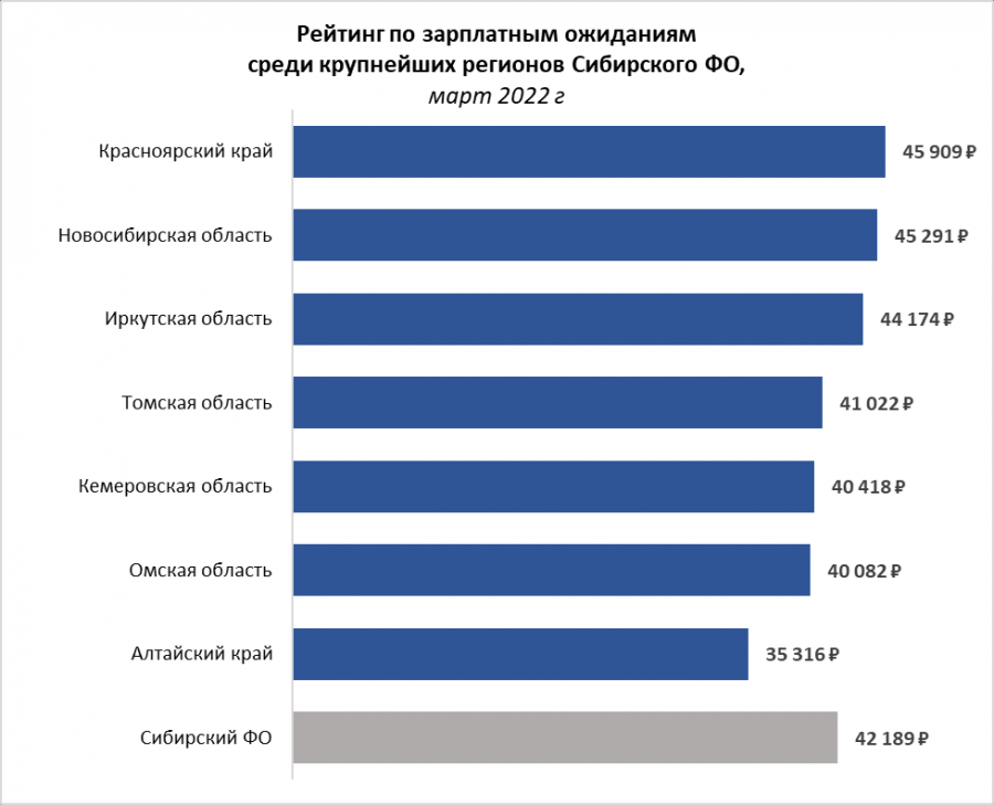 По итогам марта, зарплатные ожидания соискателей из Сибирского ФО были на уровне 42,1 тысяч рублей, в среднем. По сравнению с аналогичным периодом прошлого года, они выросли на 7%, в сумме это +2,7 тысяч рублей.