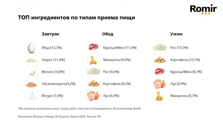 Специалисты исследовательского холдинга Ромир определили топ-5 ингредиентов на завтрак, обед и ужин.