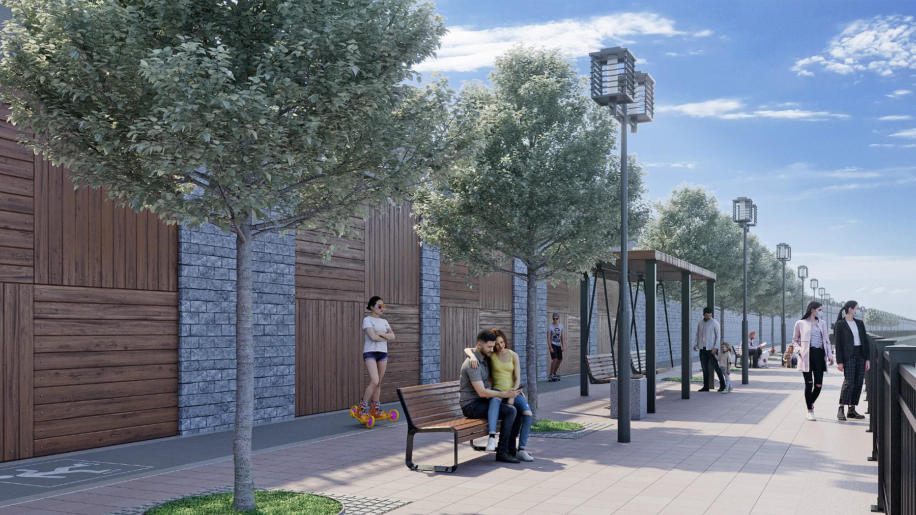 Посередине променада поставят перголы с качелями, уличные фонари, скамейки и урны. Вдоль подпорной стенки обустроят асфальтовую дорожку для катания на роликах, самокатах и велосипедах.