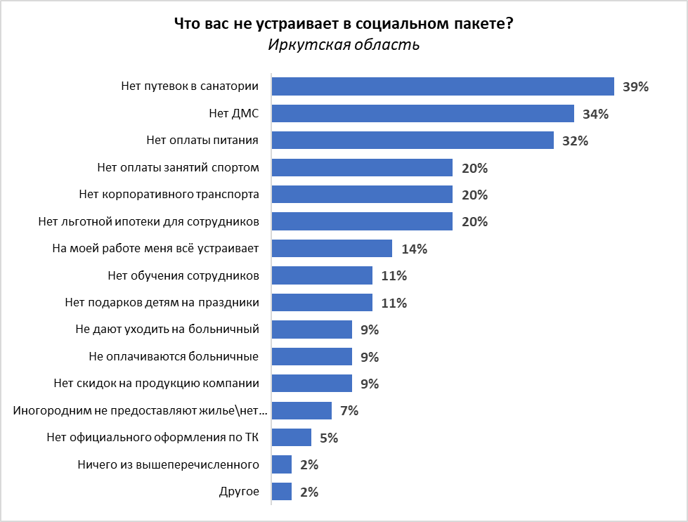 По данным опроса, 11% иркутян не устраивают их социальные пакеты. Больше всего недовольных среди специалистов из сферы закупок, сотрудников из ресторанно-гостиничного направления, а также среди водителей и специалистов из автобизнеса. Напротив, реже всего жаловались на свой соцпакет представители сельскохозяйственного направления, специалисты из сферы добычи сырья, рабочие, бухгалтеры и медики.