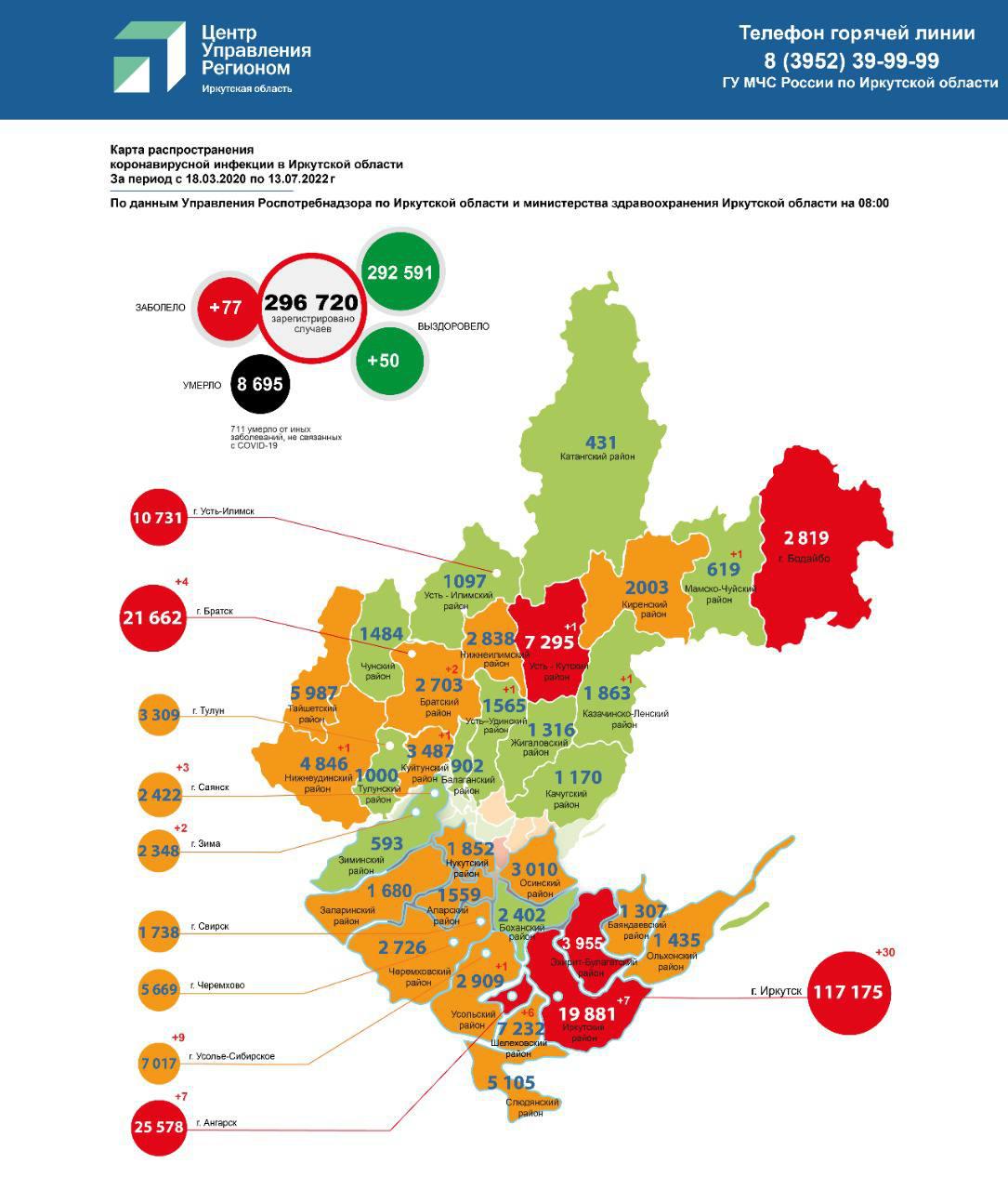 Лидер по числу заражений – Иркутск (+30), второе место за Усольем-Сибирским (+9), третье место делят Ангарск и Иркутский район (+7). Заболеваемость в остальных населенных пунктах региона не превышает 6 случаев.