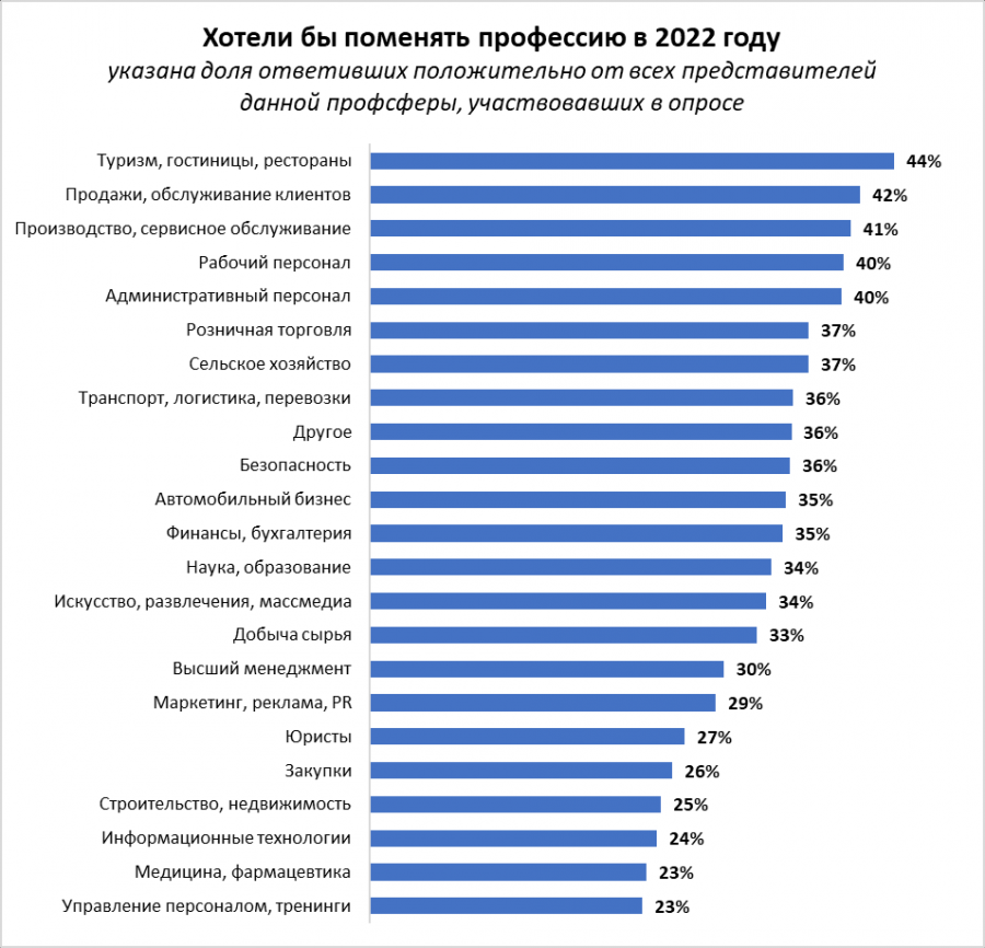 Наименьшую лояльность к своей специальности и самую высокую готовность поменять ее на другую продемонстрировали сотрудники ресторанно-гостиничного направления (44%), следом за ними идут специалисты по продажам и обслуживанию клиентов (42%) и представители сферы производства и сервисного обслуживания (41%). Кроме того, к переменам готовы 40% рабочих и столько же сотрудников из сферы административного персонала.