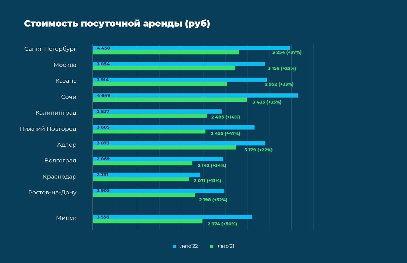 Дороже всего посуточная аренда этим летом стоила в Сочи — в среднем 4649 рублей, что на 35% больше, чем прошлым летом. На втором месте — Санкт-Петербург (4458 рублей, +37%), на третьем — Казань (3914 рублей, +33%), на четвёртом — Адлер (3873 рубля за сутки, +22%), на пятом — Москва (3854 рубля, +22%).