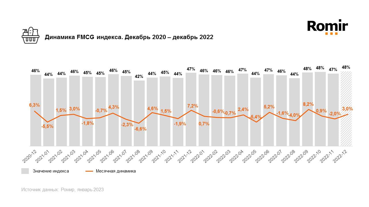 Исследовательский холдинг Ромир регулярно рассчитывает ежемесячный FMCG Index – показатель, демонстрирующий динамику доли затрат домохозяйств на продукты питания и непродуктовые категории товаров повседневного спроса в структуре всех затрат домохозяйства.