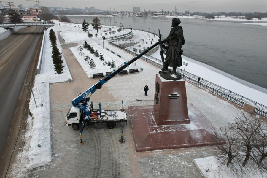 Памятники Ленину, Александру III, Якову Похабову, адмиралу Колчаку, маршалу Жукову, стелу «Город трудовой доблести» и другие монументы чистят с помощью автовышки.