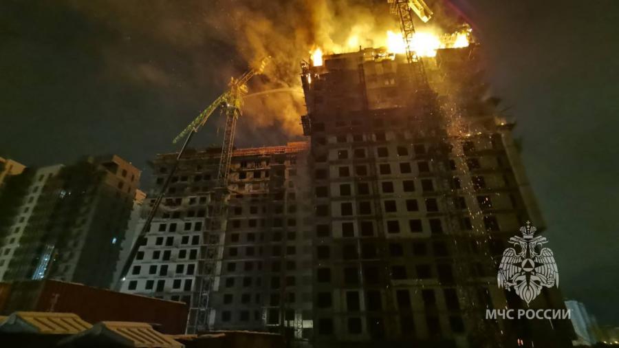 Об инциденте стало известно в 04:46. На момент прибытия спасателей горели строительные леса на 16-м этаже здания.
