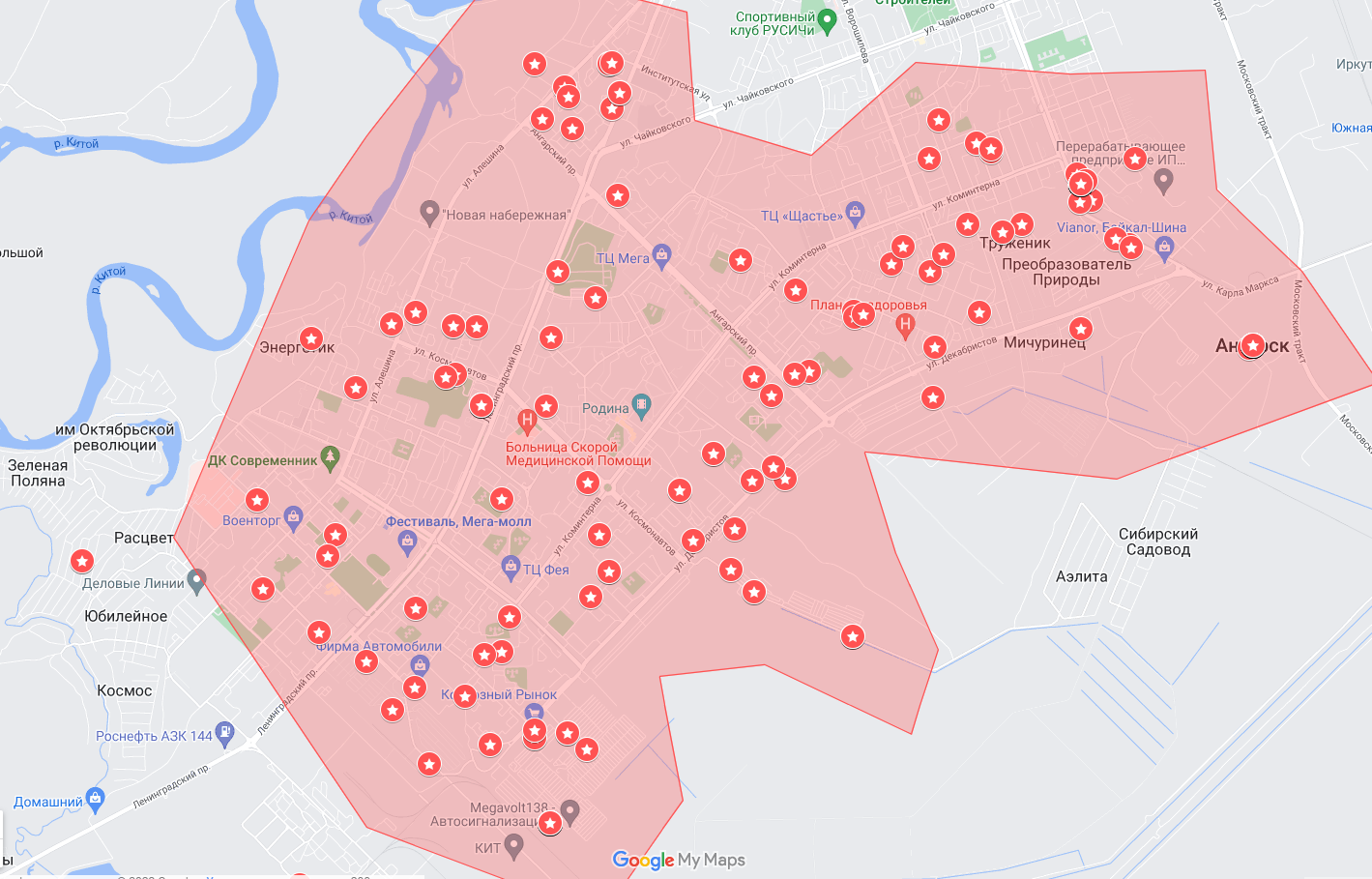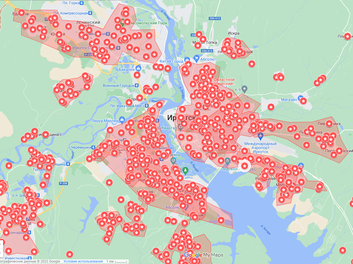 Больше всего проблемных точек в столице региона. Очертания Иркутска на карте сложно разобрать, так много сигнализирующих о нелегальном майнинге красных отметок. Далее следует ещё одно крупное муниципальное образование – это Ангарский городской округ. Здесь около 500 адресов с подозрением на добычу криптовалюты в бытовом секторе. На границе между Ангарском и Шелеховским районом также зафиксировано скопление добытчиков криптовалюты –более 300 отметок на карте. И почти не отстаёт Хомутовская агломерация, в которой насчитывается 250 обозначений. Далее за ними следуют еще два муниципальных образования– Мамоновское и Молодежное.