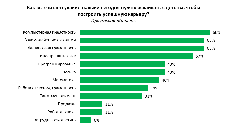 На вопрос «Какие навыки сегодня нужно осваивать с детства, чтобы построить успешную карьеру?», большинство жителей Иркутской области, назвали компьютерную грамотность (66%), взаимодействие с людьми, а также финансовую грамотность (по 63%). Любопытно, что в целом по стране топ-3 выглядит немного иначе: взаимодействие с людьми (73%), компьютерная грамотность (69%) и иностранный язык (65%).