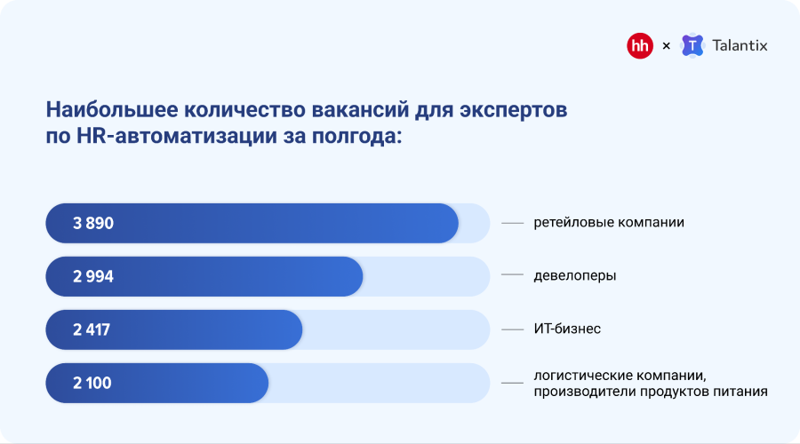 Выше всего запрос на экспертов по HR-автоматизации у представителей энергетической и добывающей отраслей, логистики, агробизнеса, а также у компаний, которые занимаются управлением многопрофильными активами.