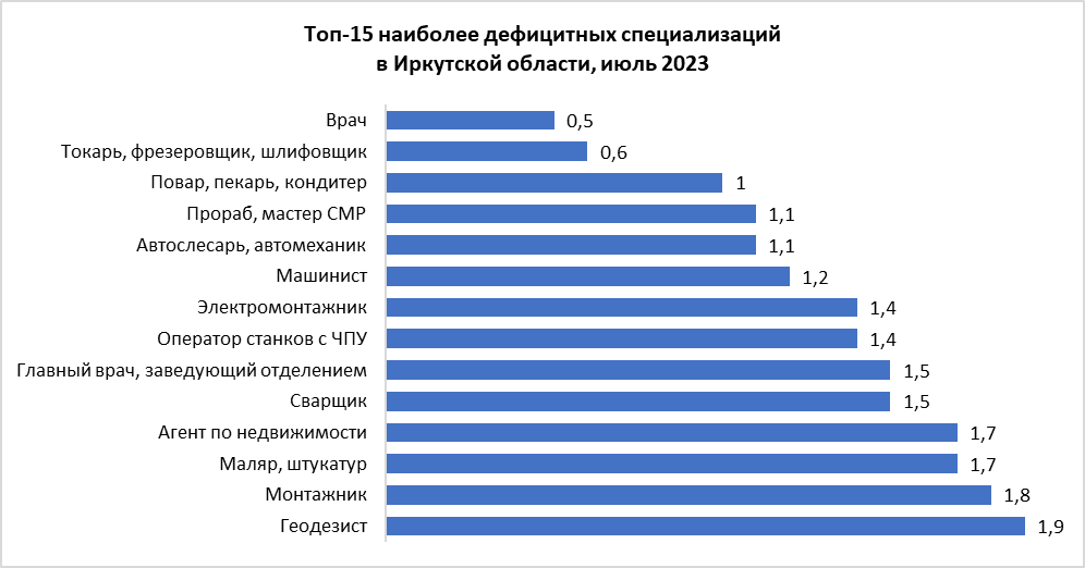 Рейтинг самых дефицитных специалистов июля в Иркутской области возглавили врачи – на одну вакансию приходится 0,5 резюме, что говорит об острой нехватке соискателей. Еще одна специальность, где резюме открыто меньше, чем вакансий – это токари (0,6 резюме на вакансию).