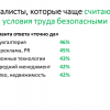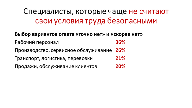 Чаще всего самые низкие оценки безопасности своей работе давали специалисты рабочих профессий (36% ответов «точно нет» и «скрее нет»), а также специалисты из сферы производства (26%).