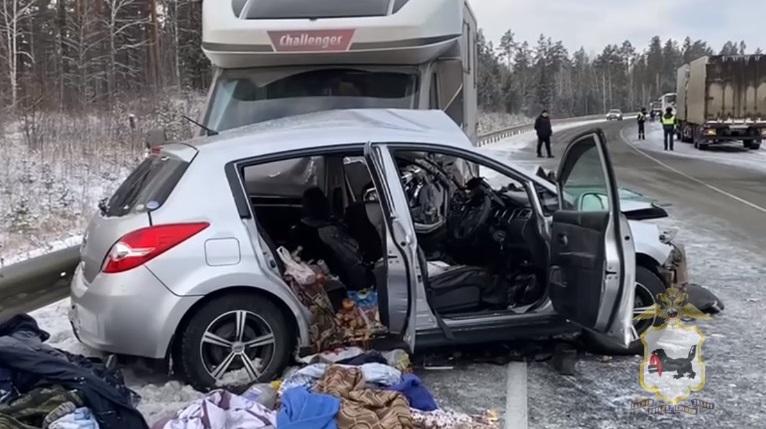 Предварительно установлено, что водитель Nissan Tiida пытался обогнать автобус и большегруз, однако во время маневра не справился с управлением и столкнулся сразу с двумя попутными машинами. В результате удара он не смог сохранить контроль над автомобилем и врезался еще и в автодом Challenger, который ехал навстречу.