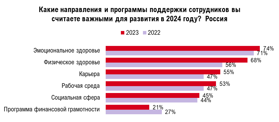 Главный позитивный результат нынешнего опроса заключается в том, что работодатели готовы уделать больше внимания программам заботы о сотрудниках в 2024 году. Пять из шести традиционных направлений, на которые нацелены такие программы (эмоциональное, физическое здоровье, карьера, рабочая среда и финансовая грамотность), показали рост заинтересованности компаний к их развитию.