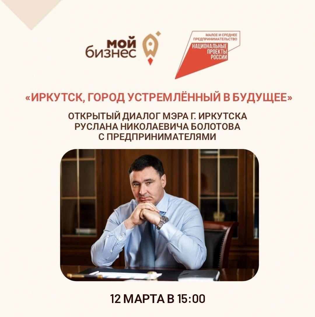 12 марта центр "Мой бизнес" приглашает предпринимателей на открытый диалог с Мэром города Иркутска Русланом Николаевичем Болотовым.