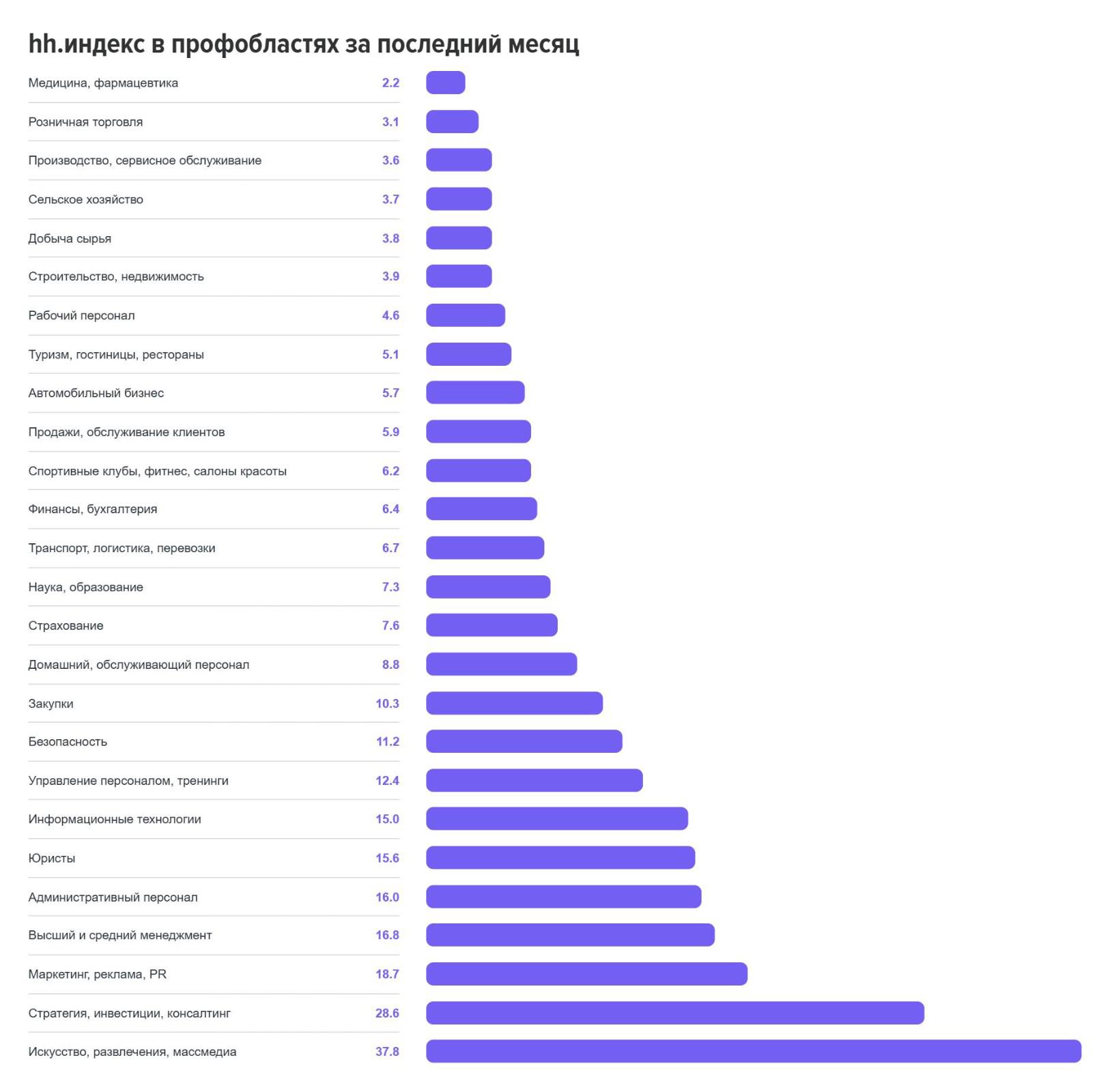 Традиционно самые востребованные направления – рабочие специальности (30% вакансий), строительство (22%) и производство (21%). Дефицит кадров сохраняется в здравоохранении (2,2 резюме на место) и розничной торговле (3,1). При этом конкуренция высока среди маркетологов (18,7 резюме на вакансию) и специалистов творческих профессий (37,8). Общий баланс рынка труда остается стабильным – на одно место приходится в среднем 5,9 активных резюме.