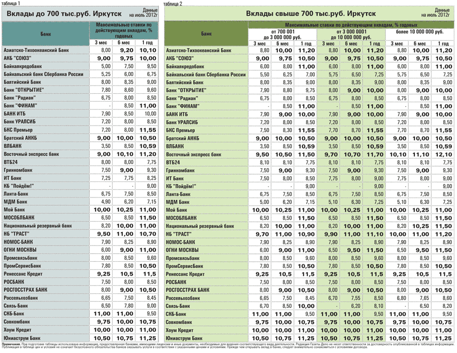 К слову, в иркутских банках самые привлекательные ставки по годовым вкладам в рублях на суммы до 700 тыс руб находятся в диапазоне от 10% до 11,5% годовых (см. таблицу 1). По данным SIA.RU на июль 2012 года, уровень доходности от 10% годовых в Иркутске по депозитам на год предлагают сразу 17 банков. Примечательно, что доходность до 11% годовых на небольших вкладах можно получить и на меньшие сроки – 3-6 месяцев.