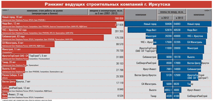 Планируя рэнкинг строительных компаний Иркутска, редакция Газеты Дело выделила четыре показателя, по которым можно судить о результативности и надежности застройщика: объем жилья, введенный компанией за последние пять лет; стаж работы на строительном рынке; аккредитация объектов компании в банках; планы компании по сдаче жилья на 2012 и 2013 годы.