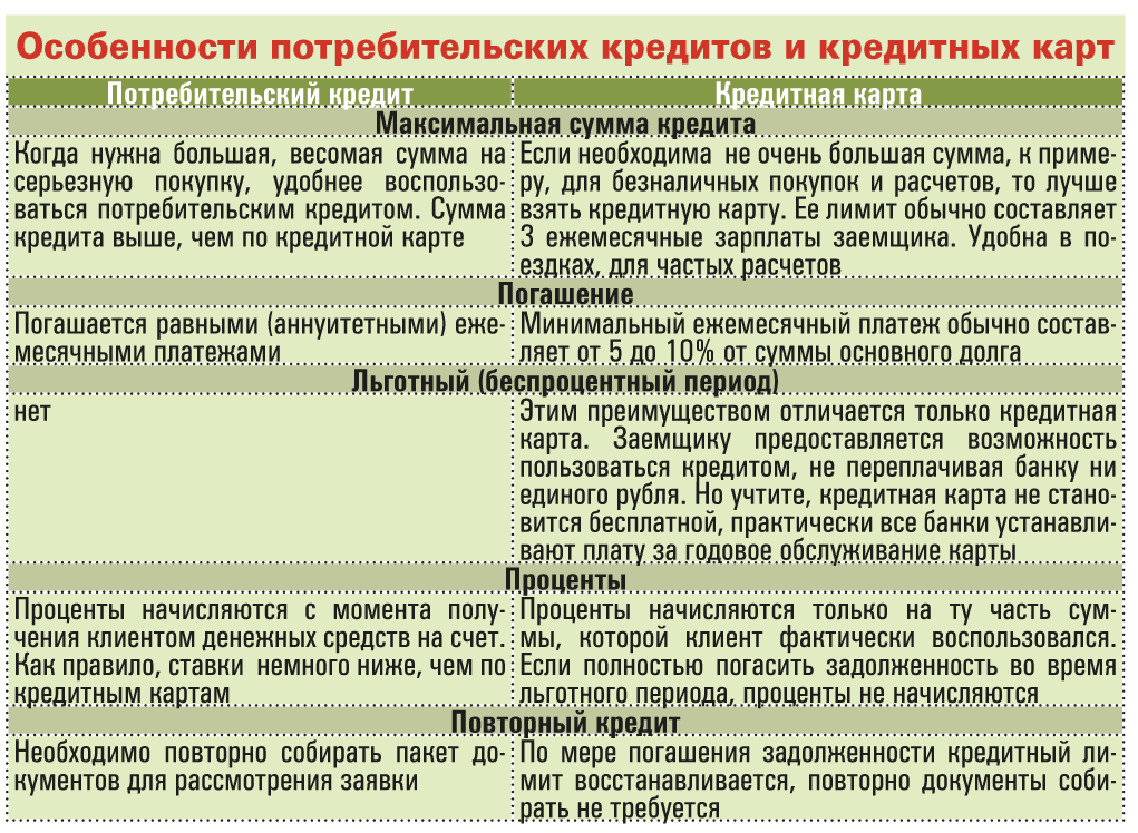 Принципиальное различие между кредитной картой и кредитом наличными в том, что по карте кредитный лимит возобновляемый, то есть, по мере погашения можно вновь воспользоваться кредитными средствами. А по потребительскому кредиту сумма разовая; для повторного использования необходимо снова собирать пакет документов для рассмотрения заявки. Это дополнительные затраты и для клиента, и для банка.