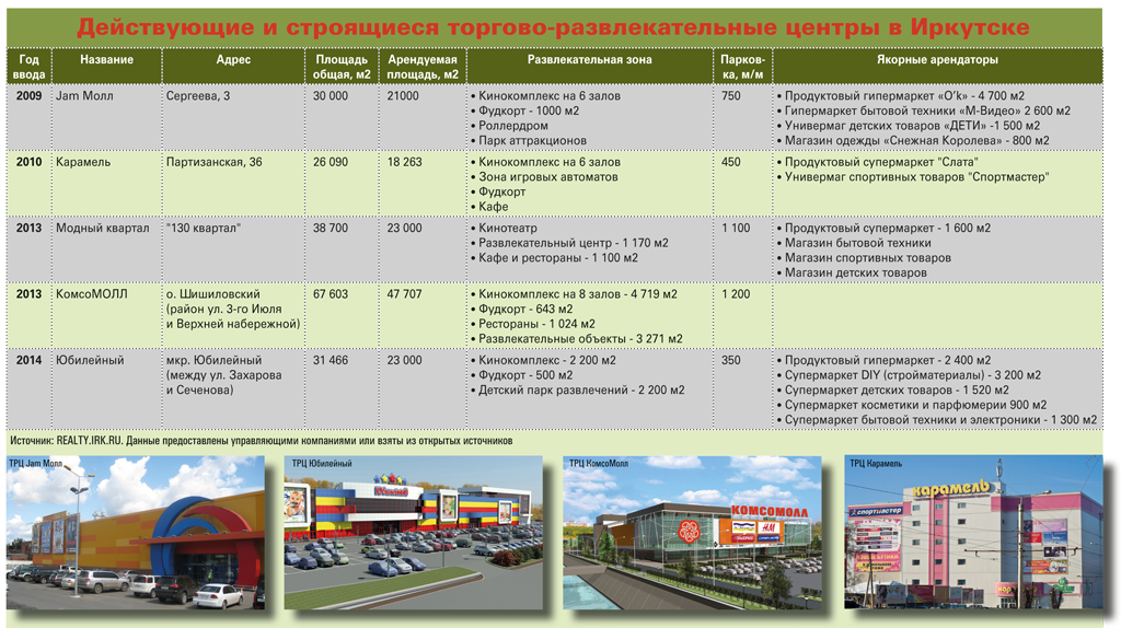 Причем последний вариант становится наиболее востребованным у потребителей. Покупателю сегодня недостаточно только совершить покупку. Торговый объект становится местом проведения досуга. А это значит, что дополнительно к торговым точкам нужно предложить какие-либо развлечения, пункты общественного питания, спортивные сервисы. Это требует больших площадей объектов. В Иркутске сейчас только два объекта отвечают этому условию: ТРЦ «Jam Mall» (30 тыс.кв.м) и ТРЦ «Карамель» (26 тыс.кв.м).