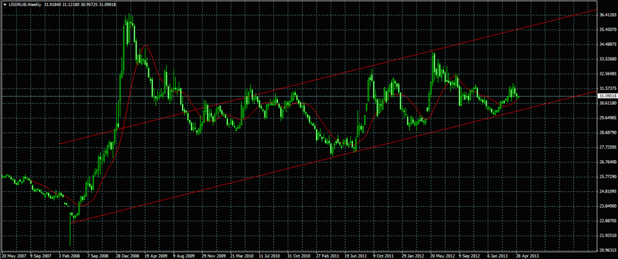 Однако небольшое ослабление все же возможно, на недельном графике пары USD/RUR виден четкий восходящий канал, и к концу года стоимость доллара может достигнуть 35 руб. 50 коп. Толчком к такому падению рубля может послужить обвал американских индексов и цен на нефть. Если второй факт трудно прогнозировать, то наступление первого условия – лишь вопрос времени. Причина роста основных индексов США кроется в денежных вливаниях со стороны ФРС и других мировых центробанков. Деньги разгоняют стоимость активов. Плюс часть капиталов возвращается с периферийных рынков в ядро финансовой системы, которым являются США. В итоге пузырь на фондовом рынке надувается все больше и больше, на мой взгляд, коррекция неизбежна.