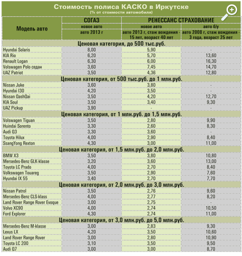 Мы обратились в Иркутске в страховые компании «СОГАЗ» и «Ренессанс Страхование» с просьбой указать стоимость полиса КАСКО по некоторым моделям авто. Действительно, стоимость страховки отличается, но не так разительно, как принято считать.