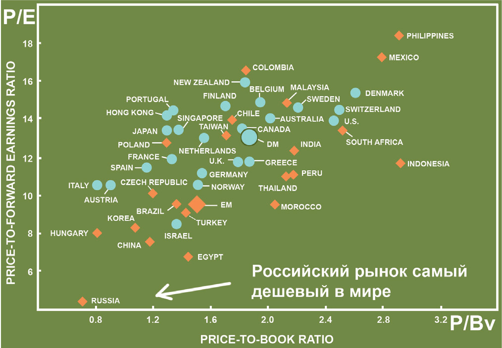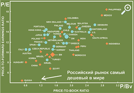 На диаграмме видно, что российский рынок самый дешевый в мире по показателям P/Eи P/Bv. Даже революционный Египет или кризисная Греция стоят значительно дороже.