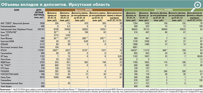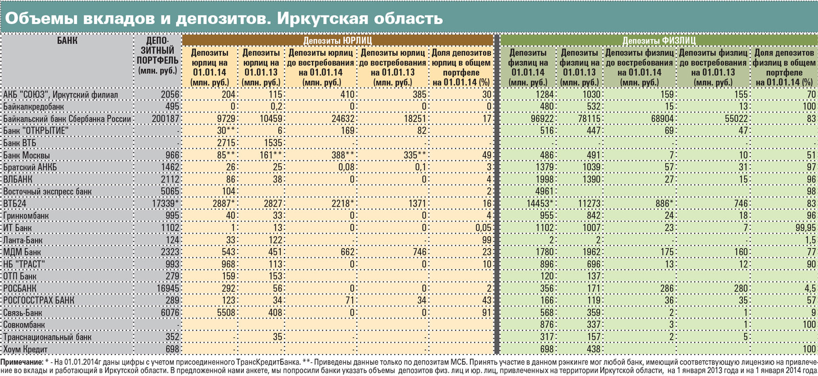 У нас «топ надежных» оказался и того меньше. Наибольшие объемы депозитов юридических лиц – объемом более 1 млрд. рублей – в Иркутской области сосредоточены в Байкальском банке Сбербанка, Связь-Банке, ВТБ24, Банке ВТБ.