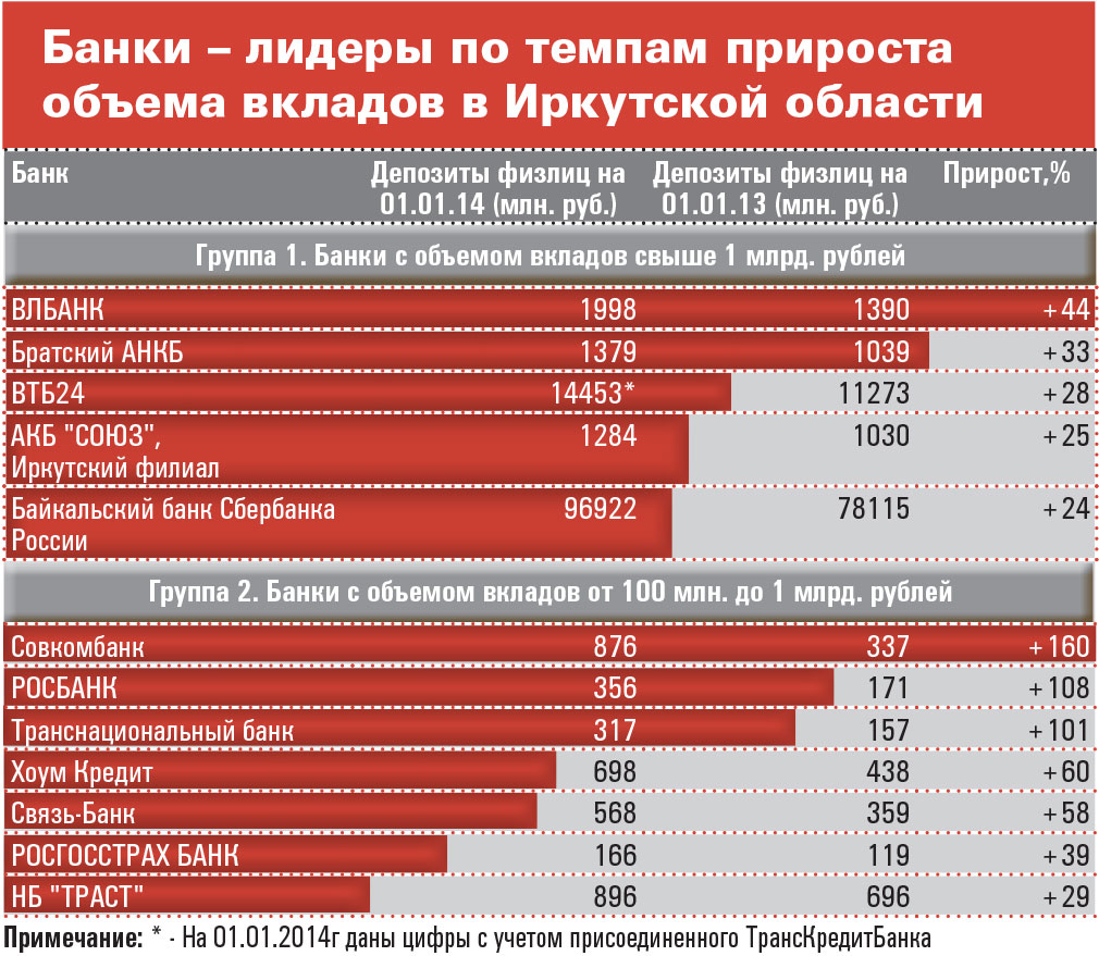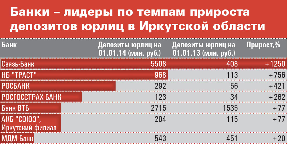Относительно невысокие темпы прироста средств юрлиц на банковских депозитах в целом по России не помешали иркутским банкам показать хорошие результаты. Так, за 2013 год Связь-Банк увеличил