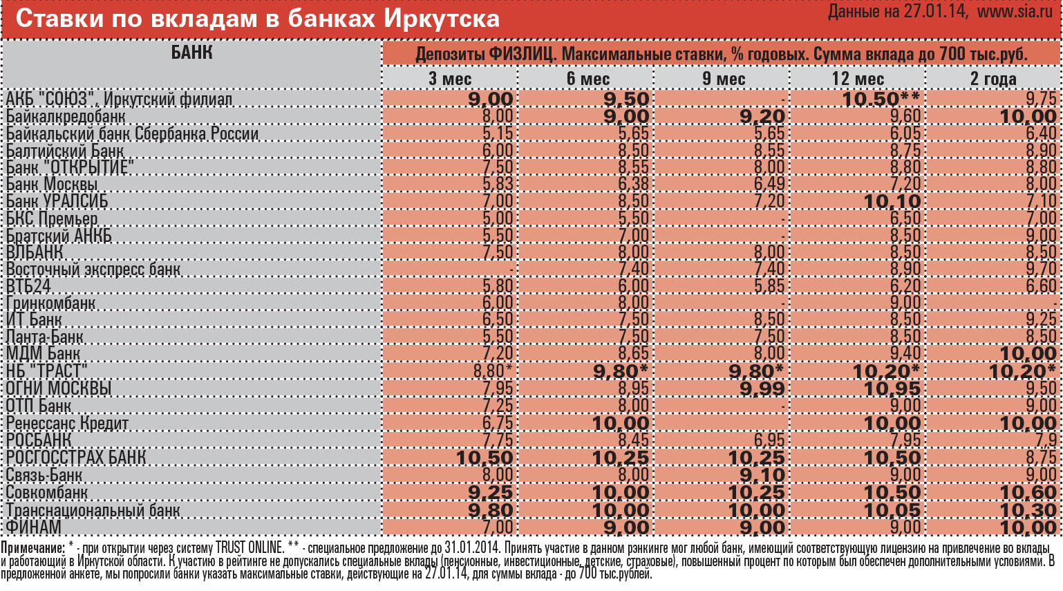 Несмотря на тенденции 2013 года по снижению ставок, клиенты продолжают размещать денежные средства во вклады российских банков. Портфель срочных вкладов физических лиц Банка «Открытие» за 12 месяцев 2013 года прирос на 8,9%. При этом в Иркутске рост портфеля был более интенсивным, чем в целом по банку, и составил 15,4%. Это говорит о том, что, несмотря на волнения на банковском рынке, связанные с отзывом лицензий у части банков, клиенты продолжают размещать средства во вклады с целью сбережения и получения доходов, выбирая более надежные и известные банки. Данная тенденция будет иметь место и в 2014 году.