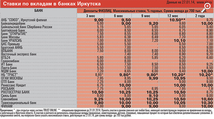 Сибирское Информационное Агентство (SIA.RU) подготовило традиционный обзор рынка депозитов в Иркутской области. Участие в рэнкинге мог принять любой банк, заполнивший анкету в срок. Мы получили ответы от 27 банков.