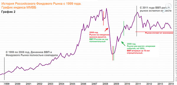 Но ваш вопрос поставлен как нельзя правильно: «Насколько фондовый рынок в России отражает процессы, происходящие в экономике?». Предлагаем обратиться к наглядной инфографике. Мы сравним динамику ВВП России с 1999 года в млрд.руб. и фондового индекса ММВБ, отражающего картину на рынке акций (см. График 1 и График 2).