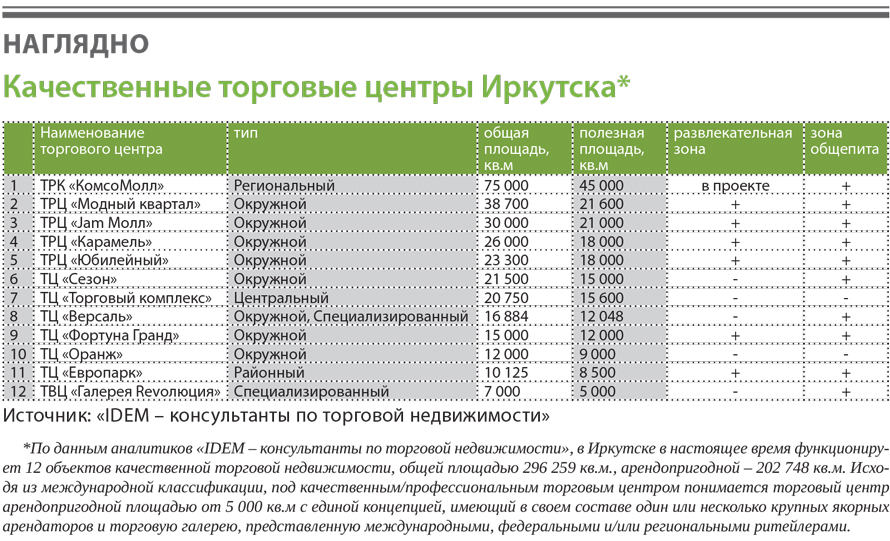 – В настоящий момент в Иркутске мало крупных, а главное – концептуальных объектов. На данный момент самым популярным торговым центром является ТРЦ «Модный квартал», а также ТРЦ «Карамель», также мы прогнозируем, что ТРЦ «КомсоМолл» постепенно будет набирать популярность.