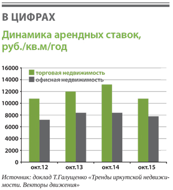 Что касается сегмента офисной недвижимости, то он чувствует себя значительно лучше, чем сегмент торговой. По словам Юрия Винникова, средняя ставка аренды офиса в Иркутске на сегодняшний день составляет 555 рублей за «квадрат», что на 4,5% меньше, чем в октябре 2014 года.