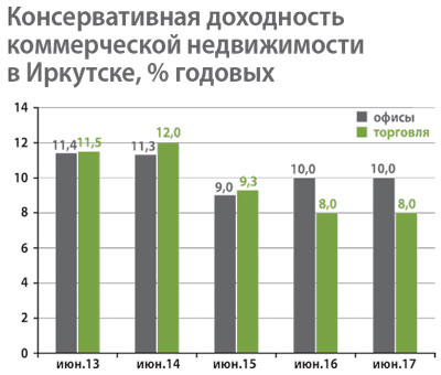 – Как показывает динамика изменений, уровень консервативной доходности за прошедший год относительно аналогичного периода прошлого года остался неизменным. Так, в среднем, на рынке офисной недвижимости доходность на июнь 2017 года составила в Иркутске 10%, на рынке торговой недвижимости – 8%.