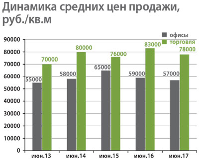 С июня 2016 года цены продажи офисной недвижимости изменились мало. В общей сложности они снизились на 3%. На рынке торговой недвижимости снижение цен продажи составило 7%. И это без учета инфляции, которая за год составила 4,5%.