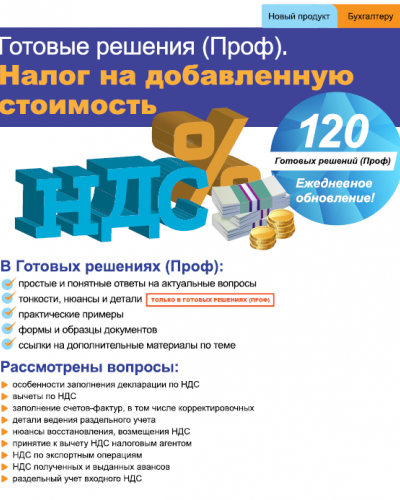 Продукт "Готовые решения (Проф). НДС" - это свыше 120 материалов по налогу на добавленную стоимость, где рассмотрены: