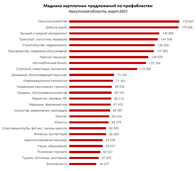 На первом месте по уровню предлагаемых зарплат на конец марта – начало апреля 2025 года в Иркутской области оказались аграрии – в среднем им предлагают 179,6 тыс. рублей. На втором месте – специалисты из добывающей сферы с зарплатой в 178,0 тыс. рублей, на третьем – представители высшего и среднего менеджмента, которым предлагают 147,0 тыс. рублей.