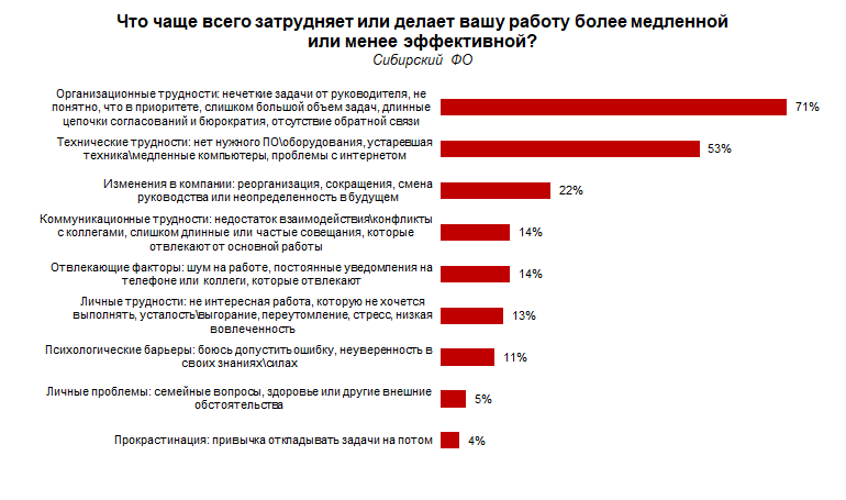 Чаще всего с рабочими сложностями сталкиваются сотрудники в возрасте от 45 лет и старше – таких оказалось 72%. Помимо организационных проблем, респонденты жаловались на устаревшую технику и нехватку необходимого программного обеспечения (53%), частые изменения в компании (22%), а также отвлекающие факторы вроде шума и длительных совещаний (по 14%).