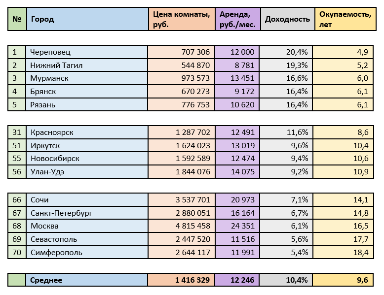 Аналитики выяснили, что аренда комнат в России приносит в среднем 10,4% годовых при сроке окупаемости 9,6 лет. Наибольшая доходность зафиксирована в Череповце (20,4%), Нижнем Тагиле (19,3%) и Мурманске (16,6%), где цены на комнаты не превышают 1 млн рублей.